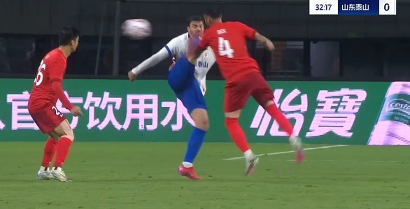 第60分钟,梅州客家少打一人,钟浩然争抢时鞋钉蹬踏到彭欣力膝盖部位,主裁判在查看回放后出示红牌将钟浩然罚下。↓