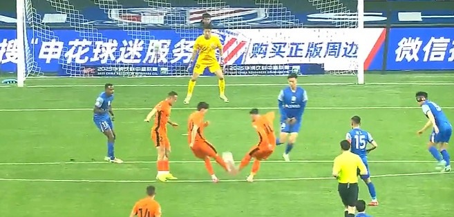 第38分钟,申花左路传球到禁区后点吴曦头球被余鉴贤神勇扑出。↓
