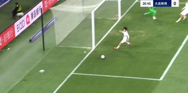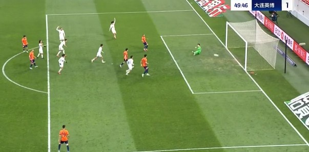 第32分钟,大连英博客场取得领先,拉布亚德左路角球开至后点被解围出禁区,吕焯毅停球之后起脚远射,皮球飞入远角,英博1-0领先青岛海牛。↓