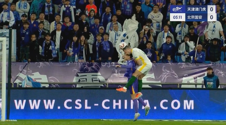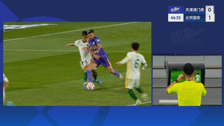 第45分钟,津门虎反击机会,基莱斯右路带球内切,柏杨解围疑似有犯规,VAR介入主裁亲自回看,认定没有点球↓