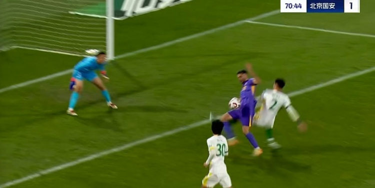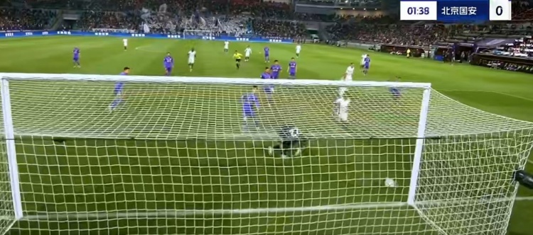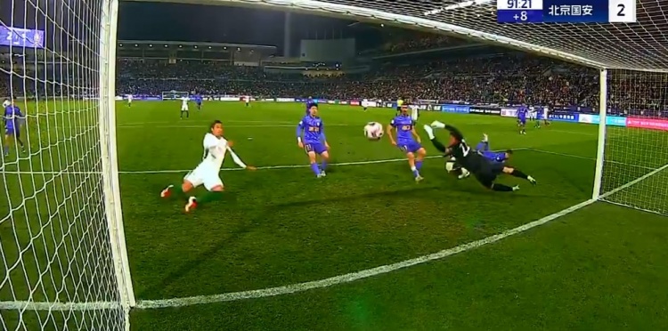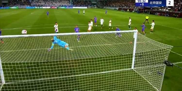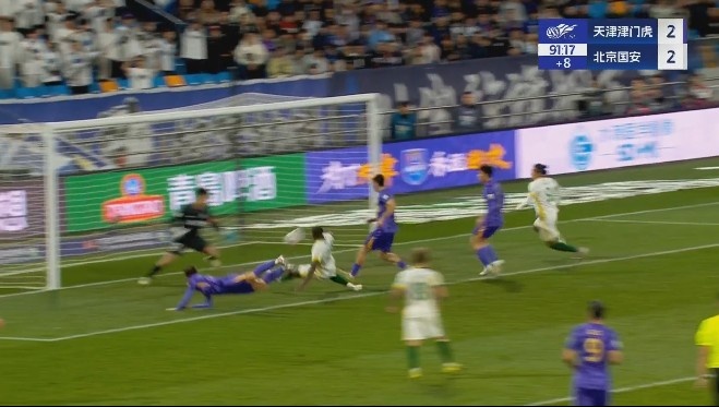 第90+2分钟,国安左侧进攻,杨立瑜起球传中,前点双方都没能顶到,皮球弹地后直接钻入网窝,国安2-2扳平比分↓
