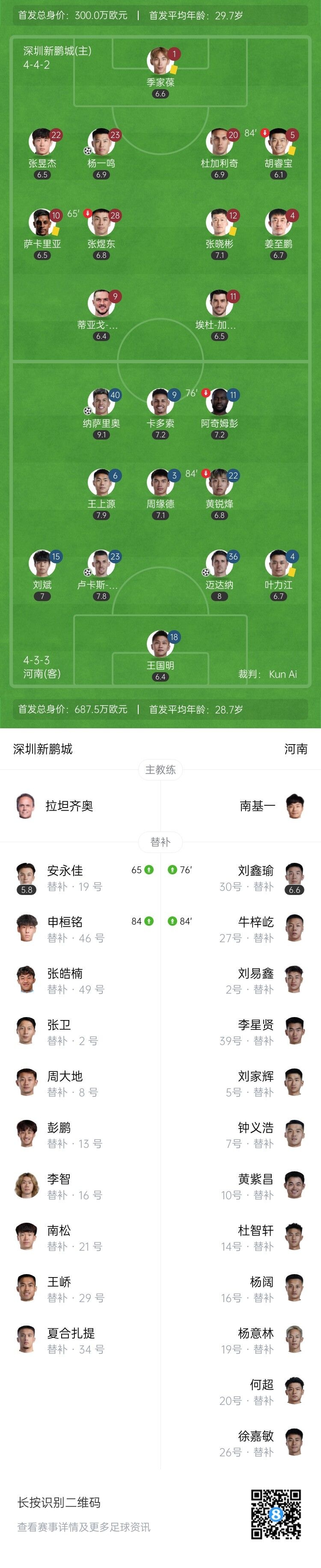 伤停补时7分钟。全场比赛结束,深圳新鹏城1-3河南。
