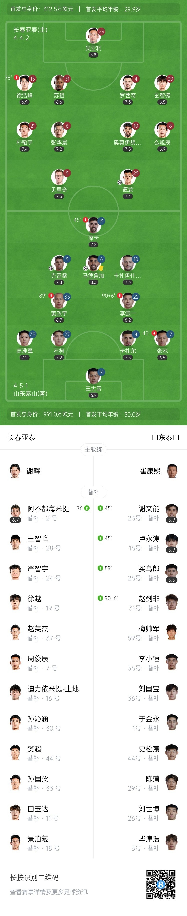 全场比赛结束,山东泰山客场2-1战胜长春亚泰。