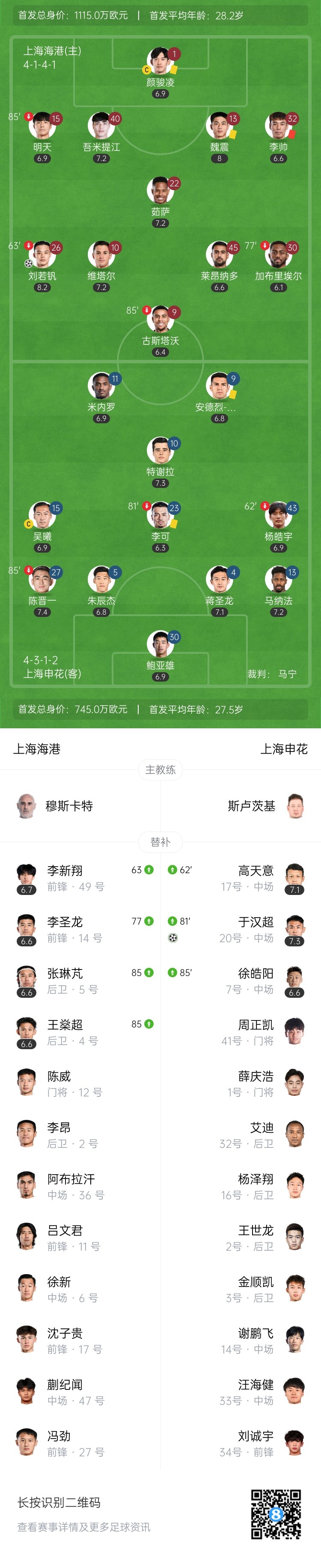 第82分钟,陈晋一左路传中,于汉超禁区中路前插头球破门,马宁经VAR确认后进球有效,上海申花1-1上海海港。↓