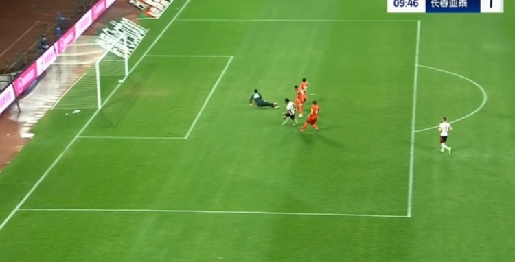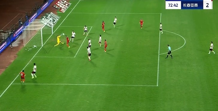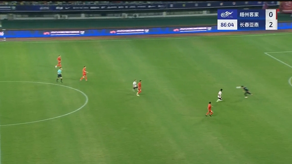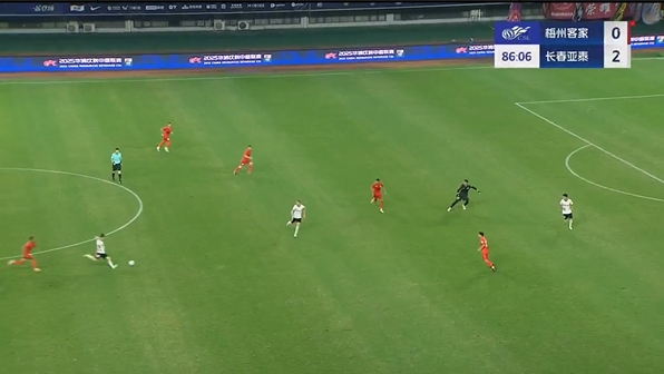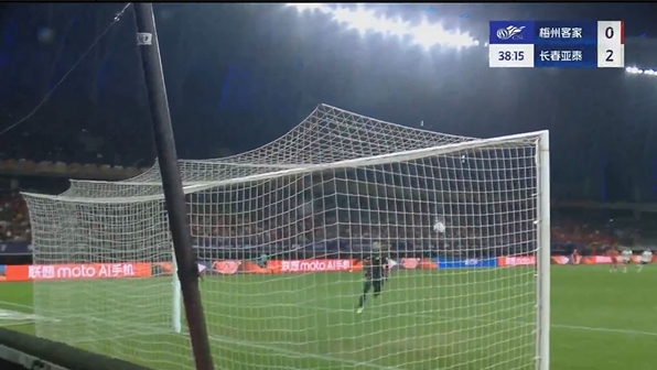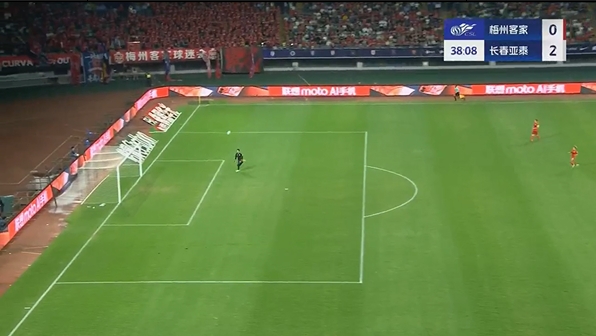 第38分钟,谭龙中场右侧得球,看门将站位靠前,直接一脚超远吊射破门,长春亚泰2-0梅州客家。↓