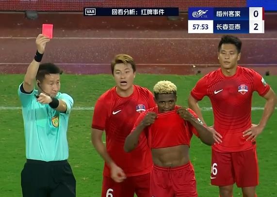 第54分钟,恩戈姆抢点攻门时在吴亚轲抱住皮球后蹬踏到其腹部,主裁判第一时间出示黄牌,但经VAR回放后改判直红将恩戈姆罚下。↓