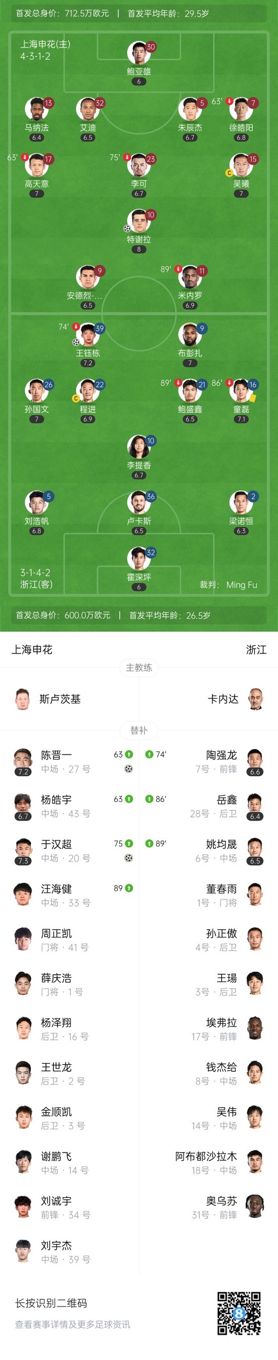 第76分钟,申花扳平比分!陈晋一左路下底传到门前霍深坪扑球不远,中路弧顶于汉超吊射破门,申花2-2浙江。↓