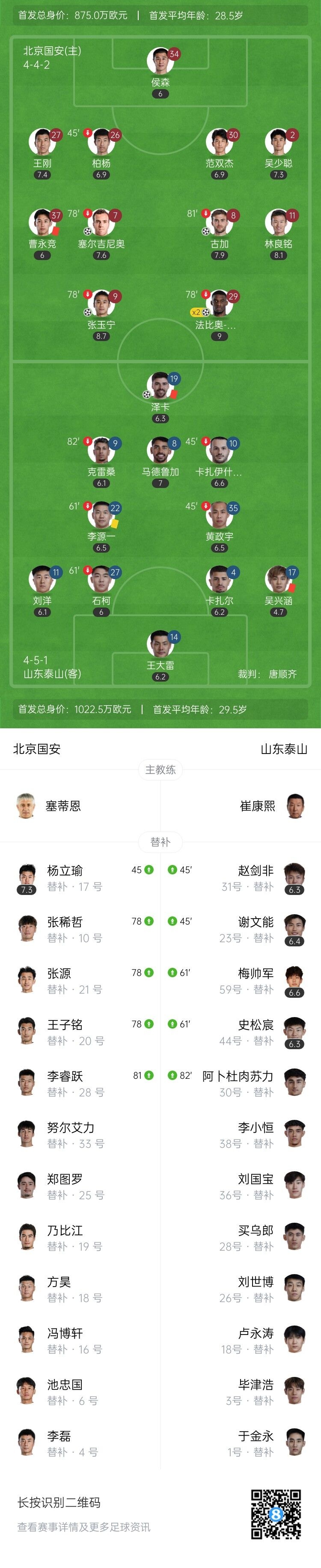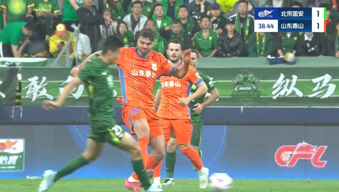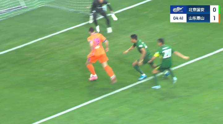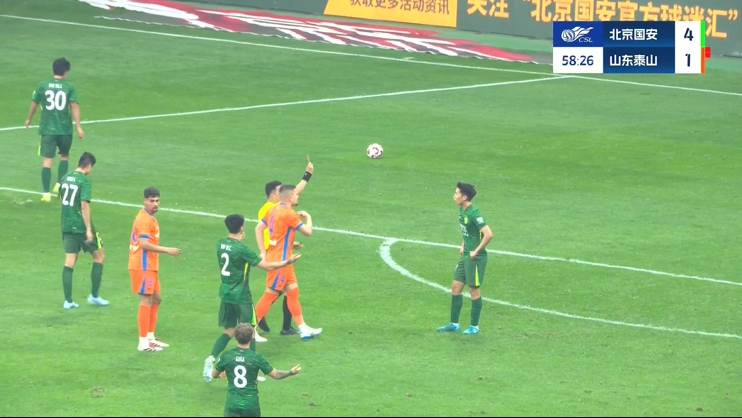 伤停补时4分钟。全场比赛结束,北京国安6-1山东泰山。