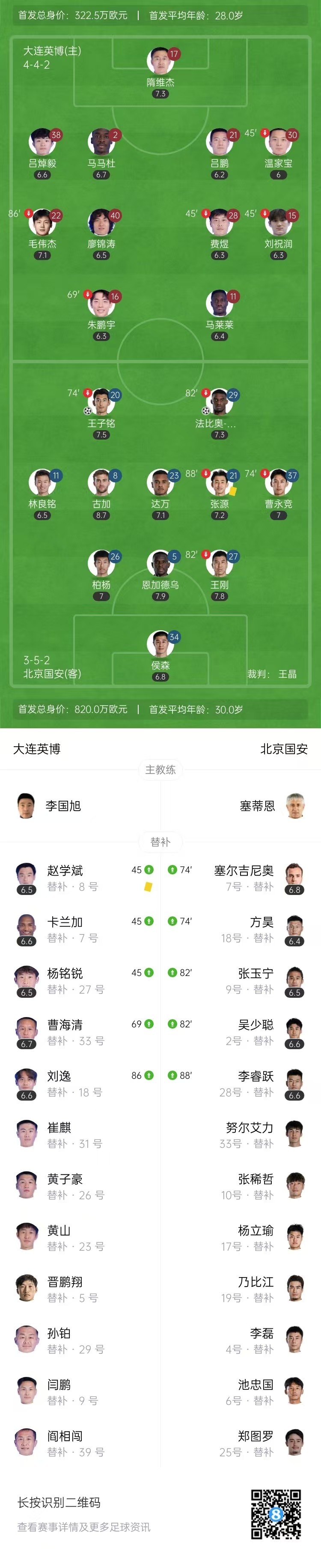 全场比赛结束,北京国安2-0大连英博。