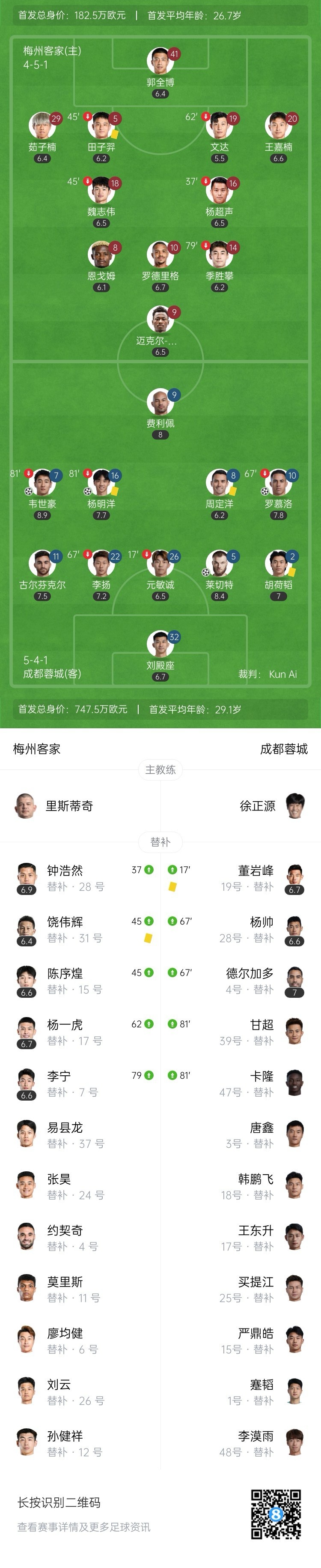 全场比赛结束,成都蓉城客场4-0大胜梅州客家。