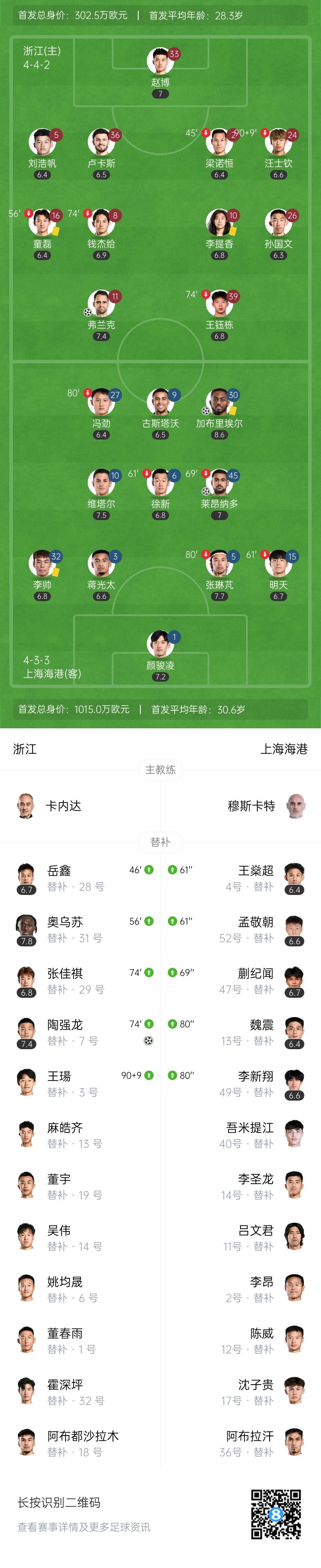 第40分钟,海港后场长传打穿浙江队防守,禁区内冯劲跟进爆射击中横梁↓