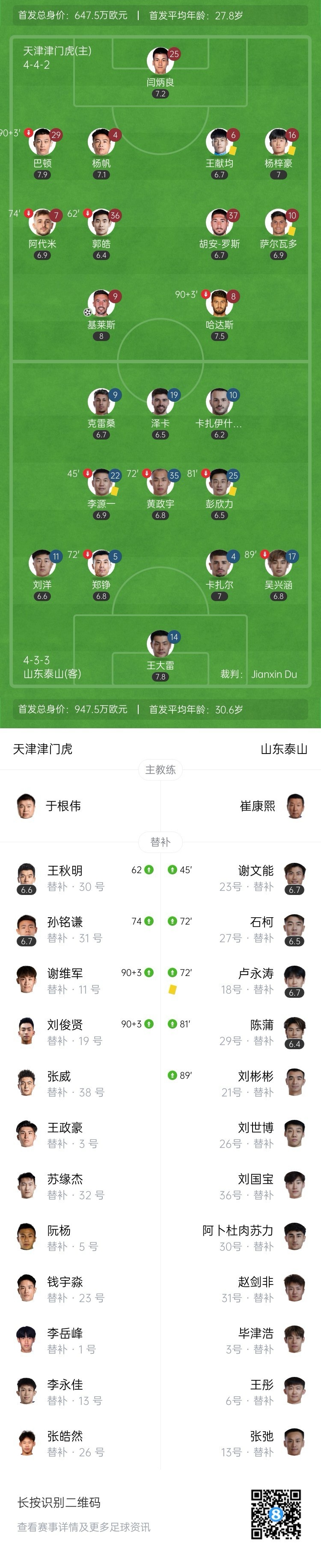 全场比赛结束,天津津门虎主场1-0战胜山东泰山。