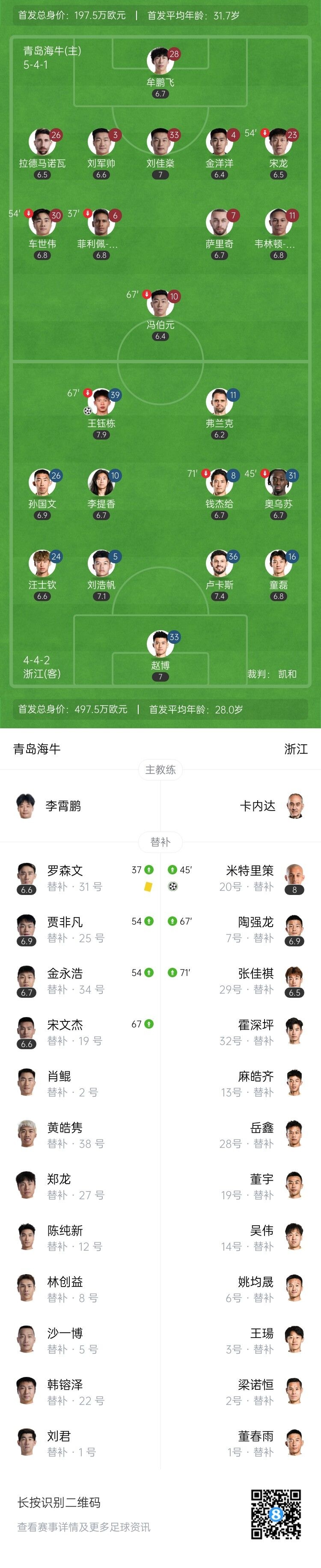 伤停补时5分钟。全场比赛结束,青岛海牛0-3浙江。