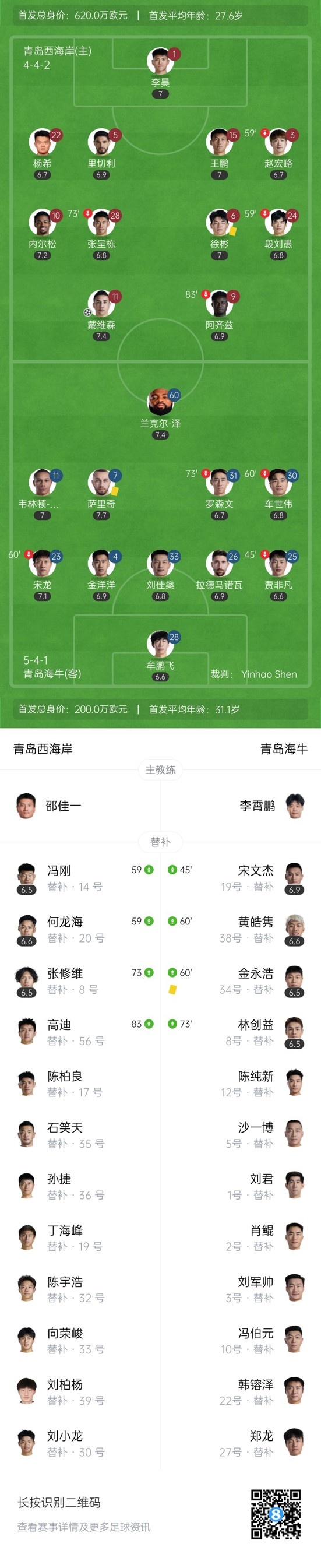 下半场补时5分钟,青岛西海岸1-0青岛海牛。