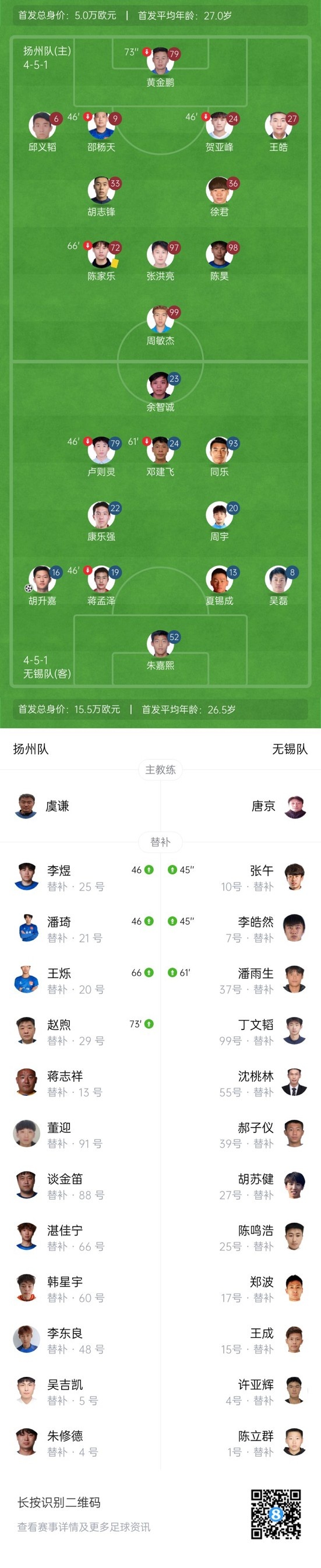 上半场补时3分钟,扬州0-1无锡。