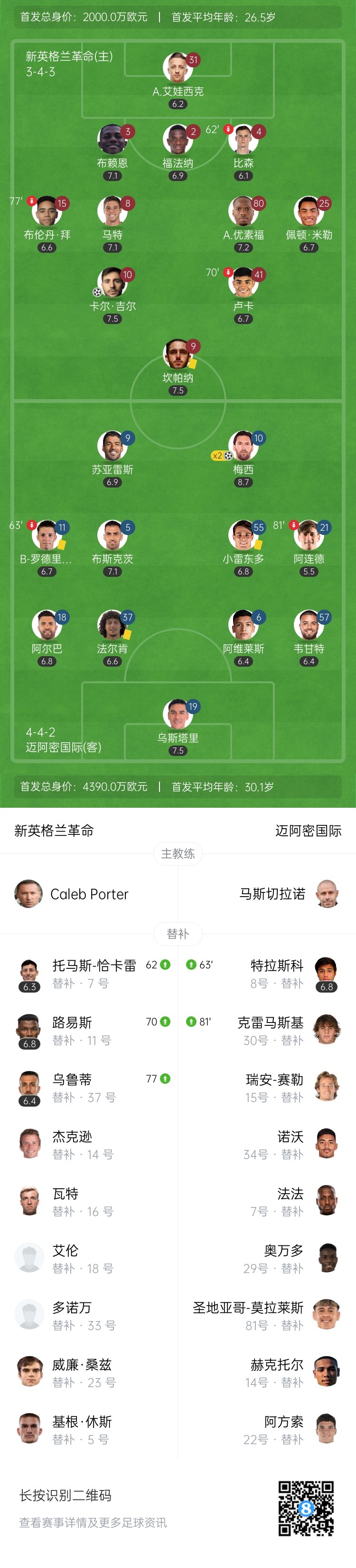 第79分钟,阿连德后场被断,卡尔-吉尔禁区前直接远射破门!新英格兰革命扳回一球1-2迈阿密国际↓