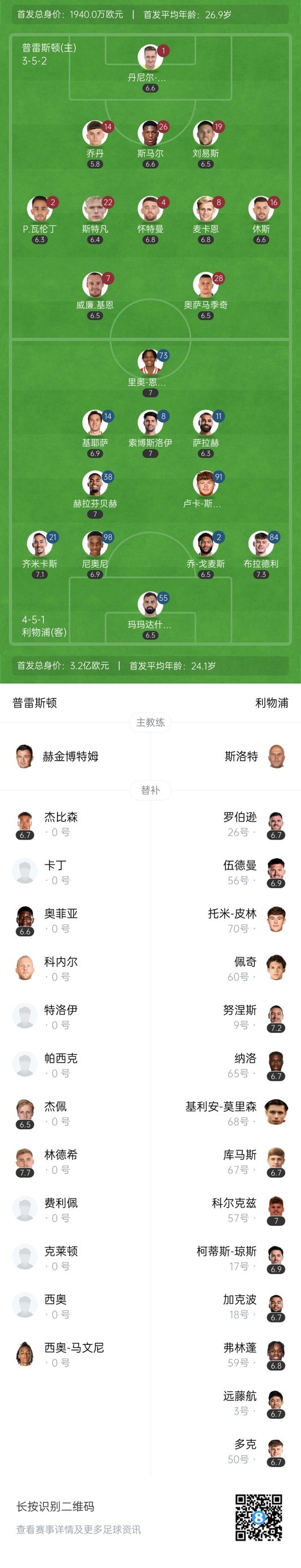 上半场补时2分钟,普雷斯顿0-1利物浦。
