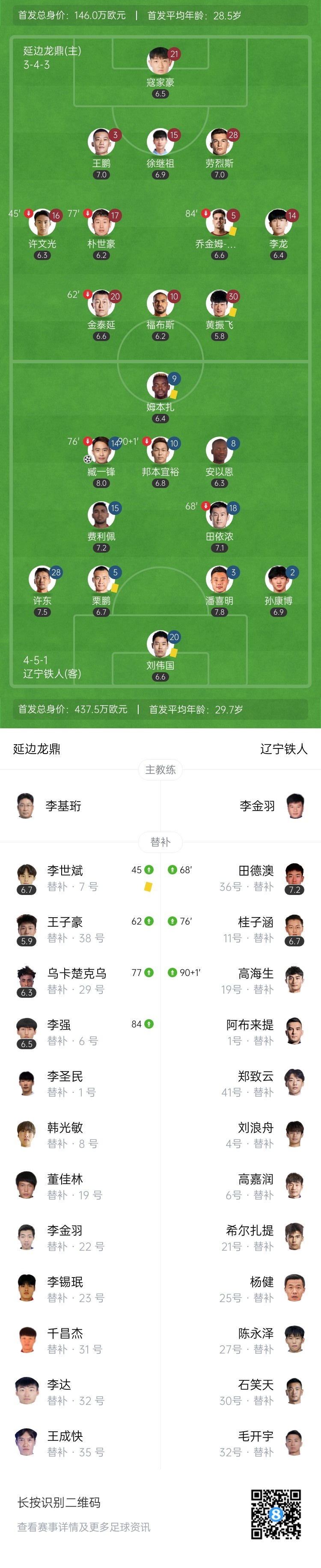 第71分钟,辽宁铁人打破僵局!左侧角球机会开到禁区中,潘喜明头球摆渡,臧一锋禁区内右侧精彩转身破门!辽宁铁人1-0领先延边龙鼎↓