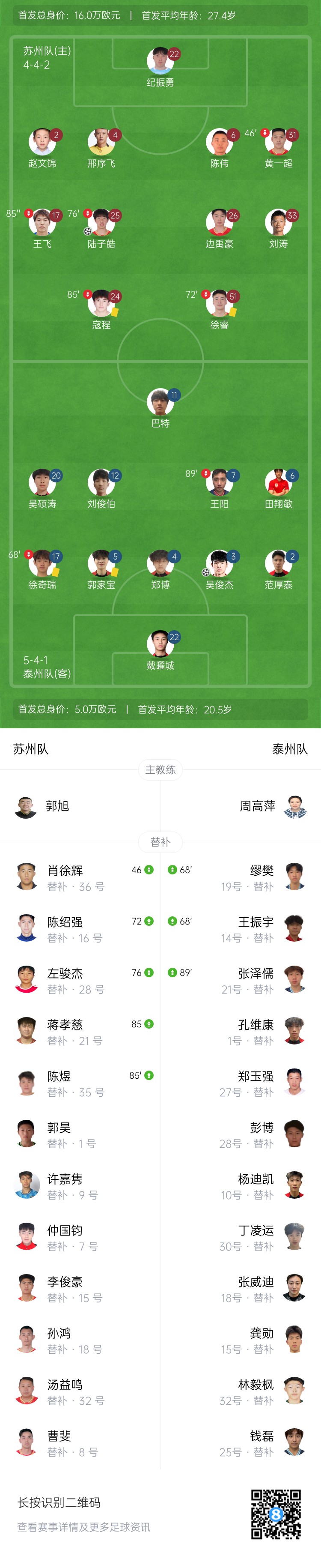 比赛第66分钟,泰州队进攻,吴俊杰禁区内停球后凌空抽射破门,泰州队1-1扳平苏州队!