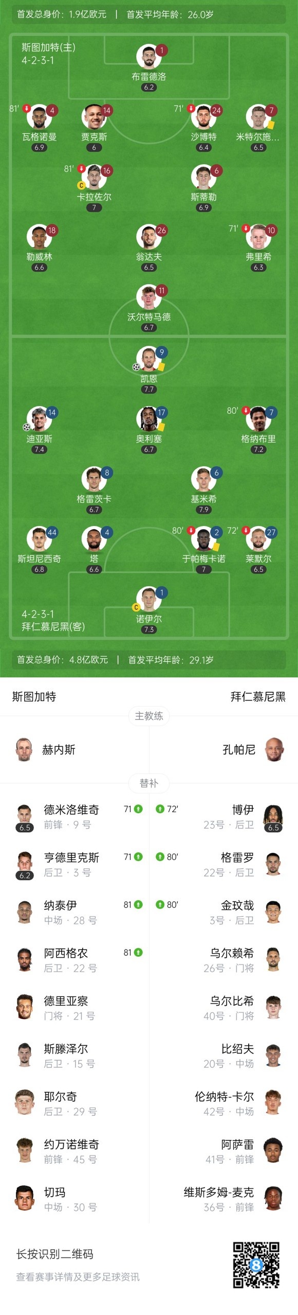 第93分钟,斯图加特扳回一城!右路边线球到禁区切玛头球摆渡门前勒威林头球破门,斯图加特1-2拜仁。↓