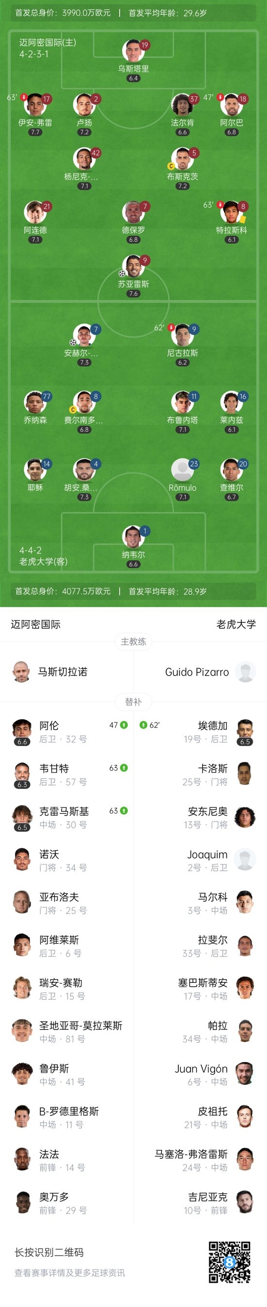 最终,迈阿密国际2-1老虎大学。