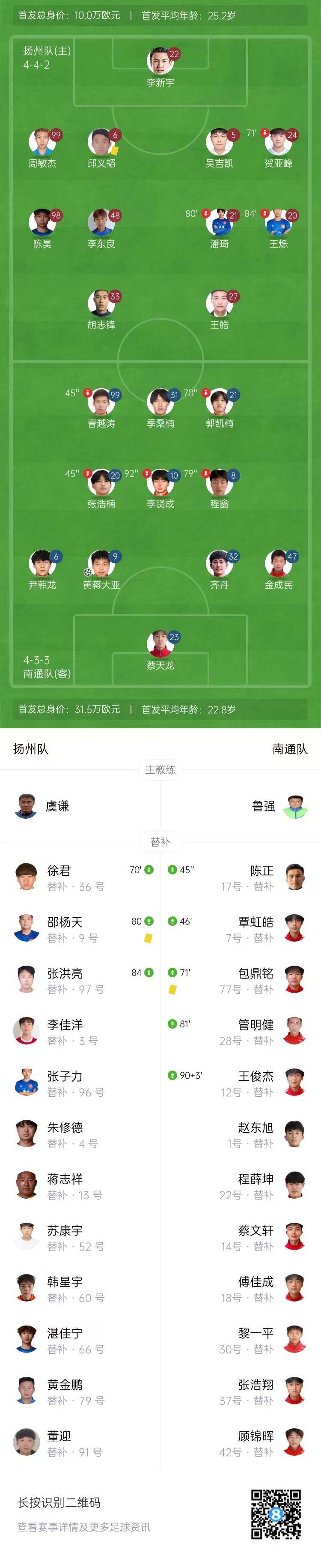 全场比赛结束,扬州0-1南通。