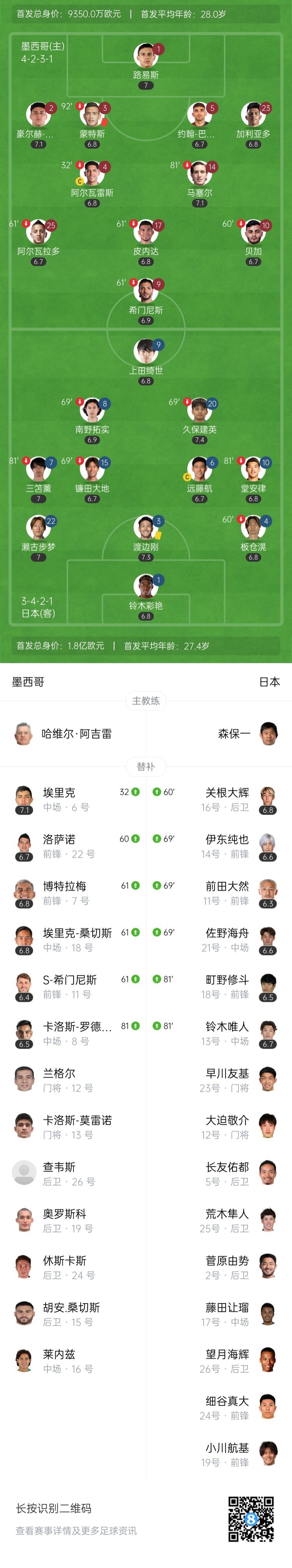 第34分钟,墨西哥左路斜长传转移右侧,三笘薰高速回防,头球回顶给门将↓