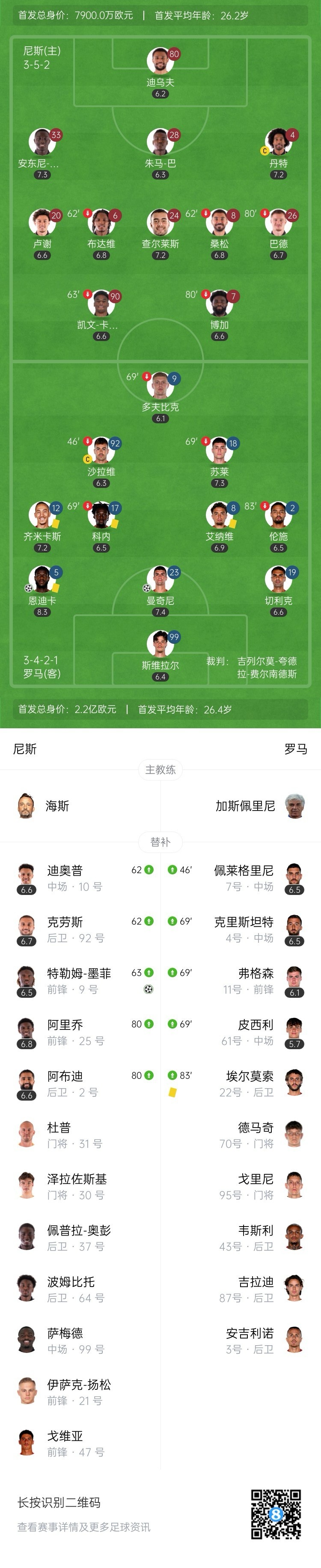 全场比赛结束,罗马客场2-1战胜尼斯。