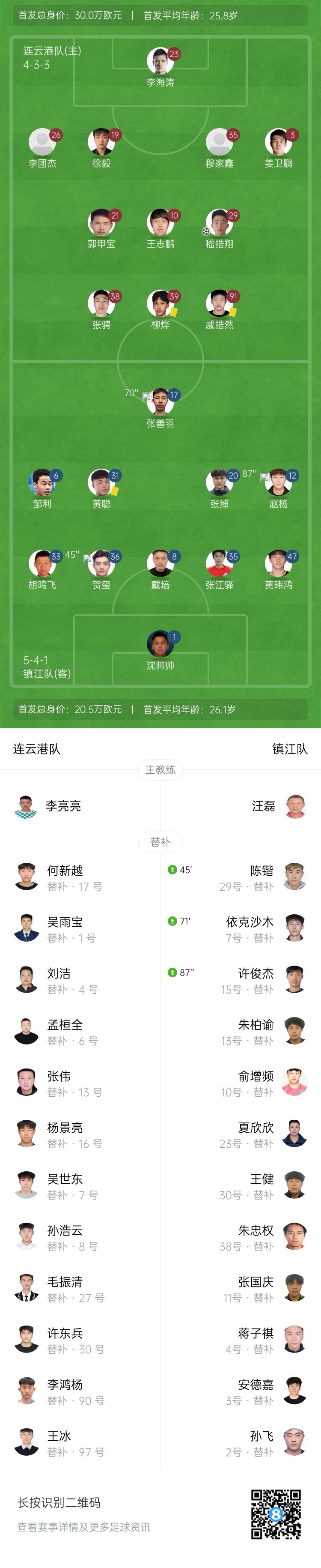 9月27日讯 北京时间9月27日19:35,江苏超第13轮,连云港队在连云港市体育中心体育场迎战镇江队。第8分钟,嵇皓翔低射破门,此后双方均未破门。最终,连云港队1-0击败镇江队,连云港队积18分排名第7晋级季后赛,镇江队11连败积3分垫底。