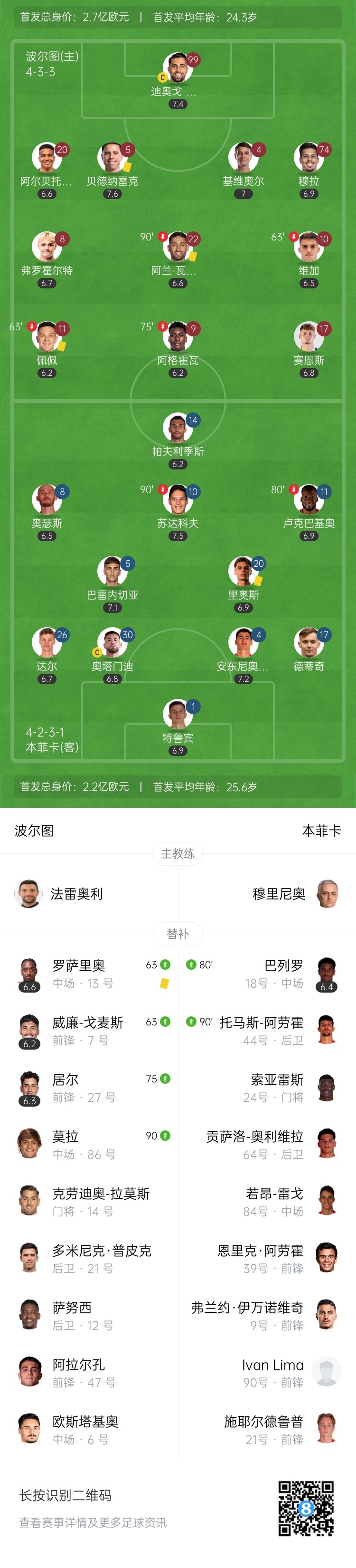 第90+2分钟,波尔图反击,莫拉禁区内调整到右脚一脚兜射!皮球击中横梁弹出↓