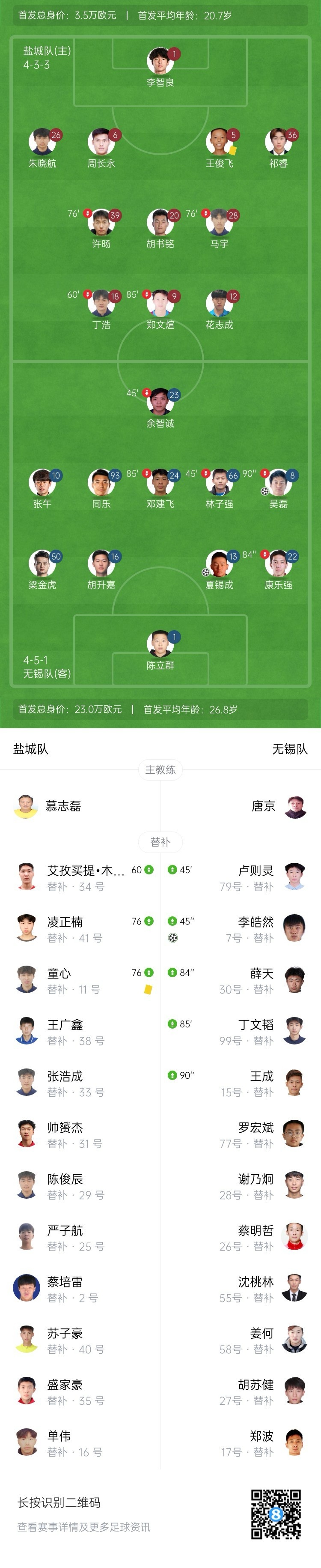 无锡客场领先!第23分钟,无锡的角球开出,周长永头球解围送乌龙助攻,吴磊门前凌空垫射得手!通过VAR,裁判改判进球有效,盐城0-1无锡!↓