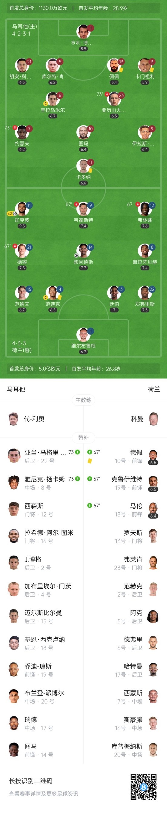 第93分钟,荷兰扩大比分!马伦右路突破到禁区被解围,邓弗里斯再传到门前德佩头球破门,马耳他0-4荷兰。↓