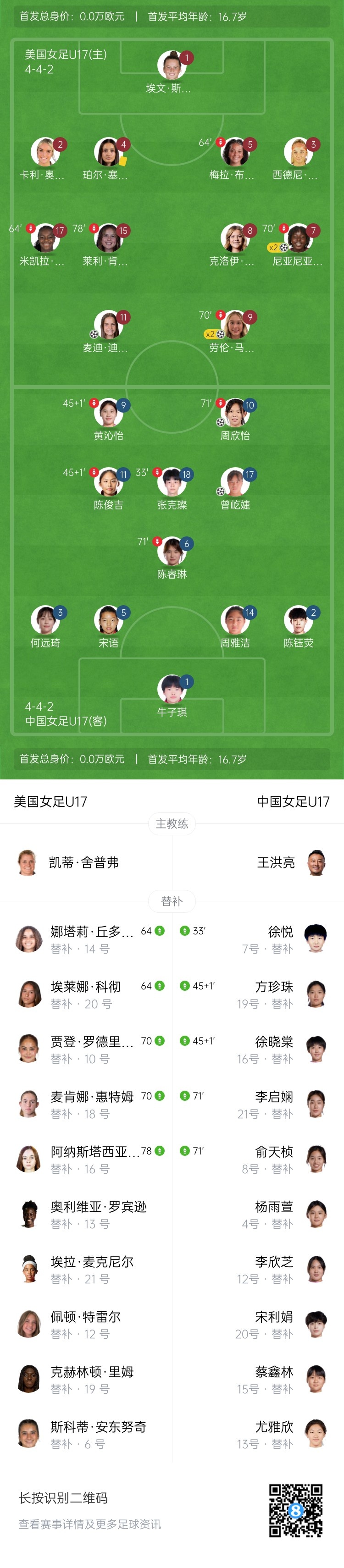 伤停补时4分钟。全场结束,中国女足U17以2-5不敌美国女足U17。