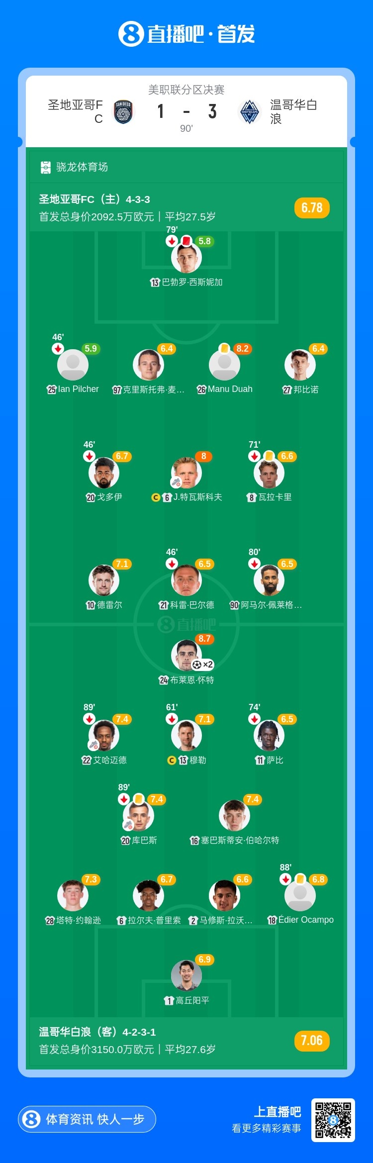 11月30日讯 北京时间11月30日上午10:00,美职联分区决赛,圣地亚哥FC坐镇骁龙体育场对阵温哥华白浪。上半场,怀特推空门,巴勃罗乌龙球,怀特双响。下半场,洛萨诺扳回一球,巴勃罗染红。全场结束,温哥华白浪3-1击败圣地亚哥FC。温哥华白浪在总决赛的对手,将是梅西领衔的迈阿密国际。