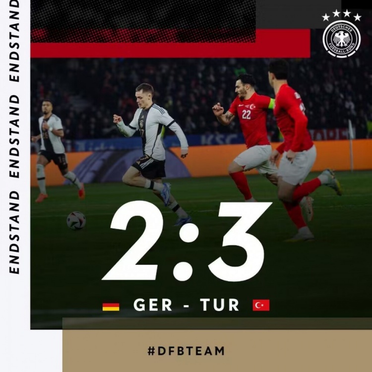 11月19日讯 北京时间3:45,德国与土耳其进行了一场友谊赛。上半场,哈弗茨首开纪录,土耳其连入两球反超;下半场菲尔克鲁格扳平,哈弗茨手球送点。最终德国2-3不敌土耳其,吞下近9场比赛的第5场败仗!