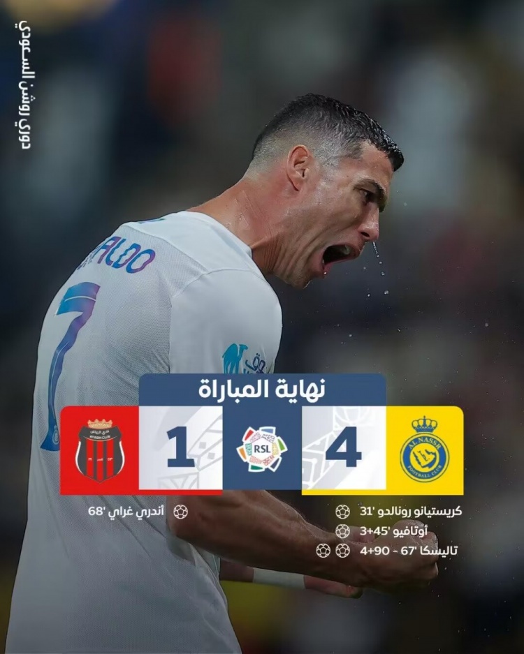 利雅得胜利出场阵容:44-阿奇迪、2-哈纳姆、78-奥贾米、27-拉波尔特、23-叶海亚、77-布罗佐维奇(76’17-海巴里)、6-福法纳、25-奥塔维奥(92’8-苏莱西姆)、94-塔利斯卡、10-马内(83’29-加里卜)、7-C罗