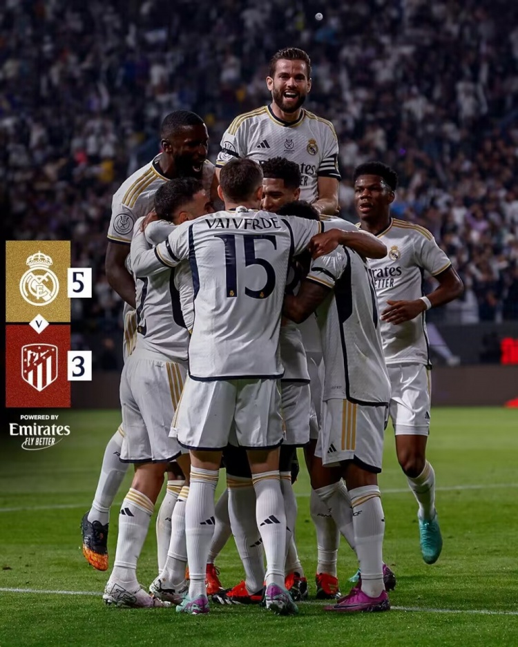 1月11日讯 西超杯半决赛,皇马迎战马竞。上半场格列兹曼角球助攻埃尔莫索头槌破门,莫德里奇角球助攻吕迪格头槌扳平,卡瓦哈尔助攻门迪进球反超比分,格列兹曼晃过魔笛远射扳平。易边再战,吕迪格躲闪不及送乌龙,卡瓦哈尔再度扳平。皇马3-3马竞进入加时赛。加时赛下半场卡瓦哈尔造萨维奇乌龙,读秒阶段奥布拉克弃门参与进攻,迪亚斯远距离推射空门建功。最终皇马5-3马竞晋级决赛,将战巴萨与奥萨苏纳的胜者。
