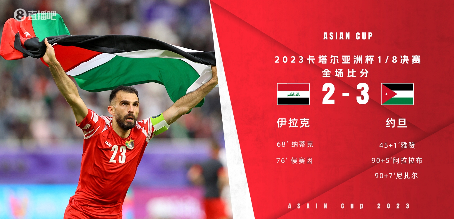 1月29日讯 北京时间1月29日19:30,亚洲杯1/8决赛,伊拉克vs约旦。上半场,双方在场上对抗激烈,奥尔万错失单刀机会,伊拉克门将哈赞屡次救险,雅赞补时破门;下半场,萨德-纳蒂克头球扳平后伤退,埃曼-侯赛因抽射打入赛事第6球反超比分,他进球后因庆祝动作吃到第二张黄牌被罚下,约旦队补时连进两球完成绝杀。最终,约旦3-2逆转伊拉克晋级8强,1/4决赛对阵塔吉克斯坦。