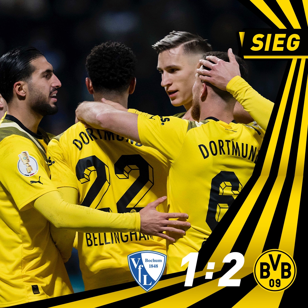 2月9日讯北京时间2月9日凌晨3:45,德国杯1/8决赛,多特客场对阵波鸿。上半场,埃姆雷-詹中圈吊射为多特取得领先!下半场,吉滕斯送点,斯特格点射扳平比分,随后贝林厄姆助攻罗伊斯破门!全场比赛结束,多特蒙德2-1波鸿晋级下一轮!