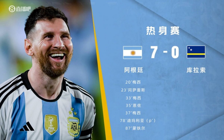 3月29日讯 北京时间3月29日07:30,国际友谊赛阿根廷迎战库拉索的比赛,上半场梅西打进国家队第102球以及生涯第57次帽子戏法,冈萨雷斯、恩佐建功,半场结束,阿根廷5-0库拉索。下半场迪马利亚点射,蒙铁尔破门,最终阿根廷7-0库拉索。
