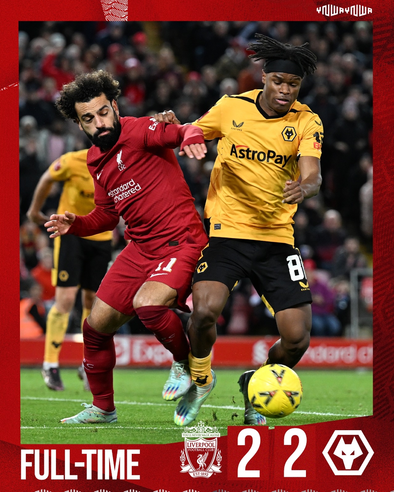 1月8日讯 北京时间1月8日凌晨4点整,2022-23赛季足总杯第3轮在安菲尔德球场展开角逐,利物浦坐镇主场迎战狼队。上半场阿利森失误送礼,格德斯破门,努涅斯破荒扳平;下半场萨拉赫反超比分,黄喜灿替补建功,托迪终场前破门被吹越位。最终利物浦主场2-2战平狼队,红军各项赛事两场不胜,双方将择日在狼队主场重赛。