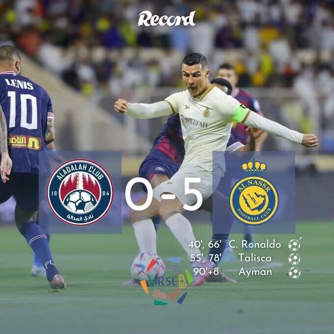 4月5日讯 北京时间4月5日03:00,沙特联赛第22轮利雅得胜利挑战哈萨正义的比赛,上半场阿姆里造点,C罗点射破门,下半场塔利斯卡、C罗均完成双响,叶海亚补射建功,最终利雅得胜利客场5-0大胜哈萨正义。