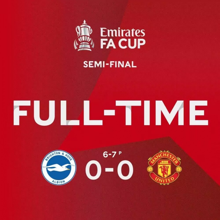 4月24日讯 北京时间4月23日晚23:30,英格兰足总杯半决赛在温布利大球场展开角逐,布莱顿对阵红魔曼联。上半场,双方互有攻守,但是没能破门,三笘薫造险,最终上半场比赛结束,曼联0-0暂平布莱顿。下半场,安东尼射门被扑,双方依旧无法打破僵局,最终90分钟比赛结束,曼联0-0布莱顿进入加时;加时赛双方互交白卷,比赛进入点球大战,布莱顿马奇打飞点球,最终全场比赛结束。曼联通过点球大战7-6淘汰布莱顿晋级足总杯决赛。