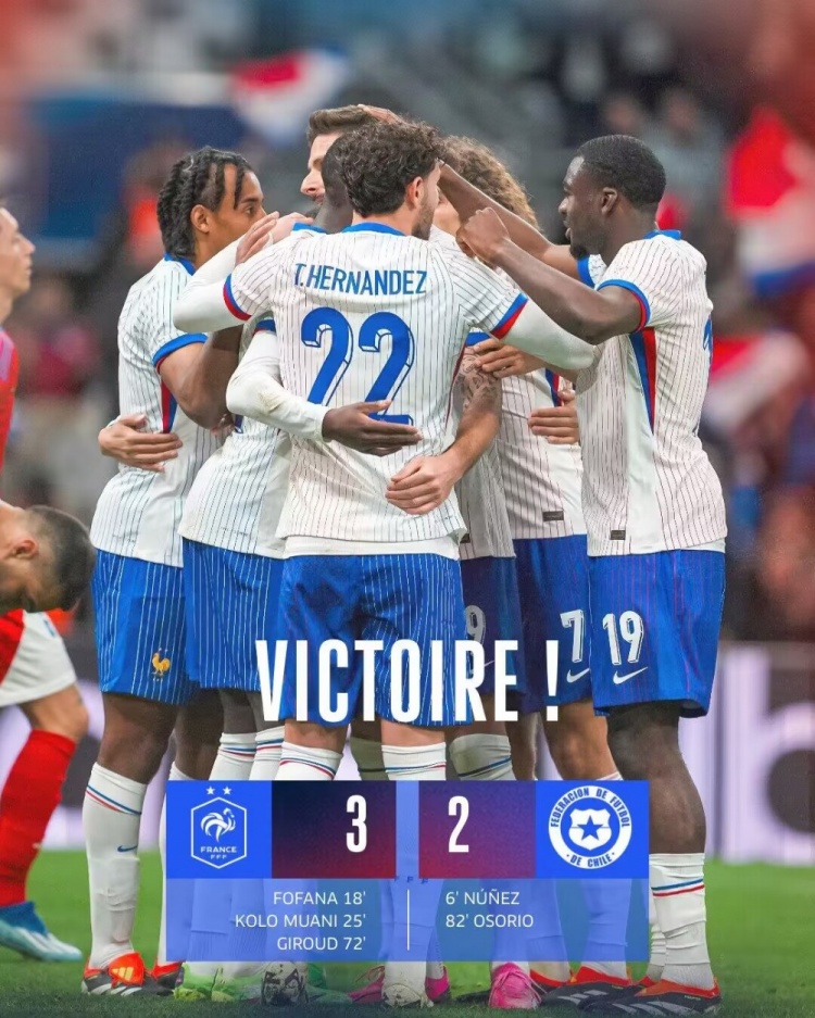 3月27日讯 北京时间3月27日04:00,国际足球友谊赛法国迎战智利的比赛,上半场努涅斯抽射闪击得手,姆巴佩助攻福法纳远射扳平比分,特奥助攻穆阿尼头球反超比分,克劳斯、卡马文加伤退,下半场巴尔加斯头球中柱,穆阿尼助攻吉鲁扩大比分,奥索里奥远射建功,最终法国3-2逆转智利。
