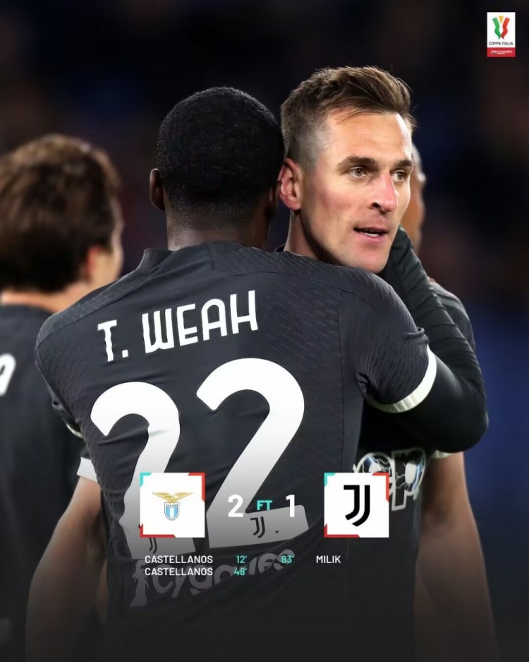 4月24日讯 北京时间03:00,意杯半决赛,尤文图斯客场对阵拉齐奥。首回合,尤文2-0占据先机。上半场,瓦伦丁头球暴扣桑德罗;下半场,瓦伦丁闪击完成双响;阿莱格里神换人,替补登场的维阿和米利克连线,米利克83分钟制胜!最终,尤文总比分3-2击败拉齐奥,晋级意大利杯决赛!他们的对手将是佛罗伦萨与亚特兰大的胜者。