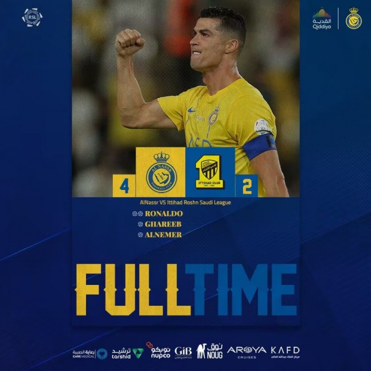 下半场补时8分钟。最终全场比赛结束,利雅得胜利4-2吉达联合。