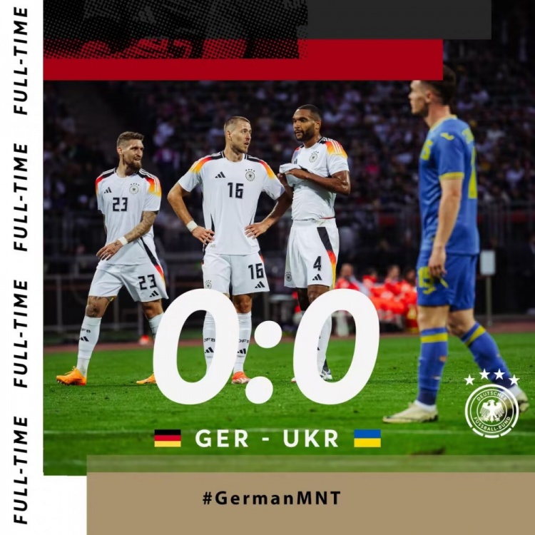 6月4日讯 北京时间6月4日凌晨2点45分,2024年足球友谊赛展开角逐,德国对阵乌克兰。上半场德国场面压制但未能收获进球,下半场拜尔替补中柱,穆勒禁区倒地未判点,诺伊尔出击失误险送礼。最终德国0-0战平乌克兰,德国全场27脚射门未果。