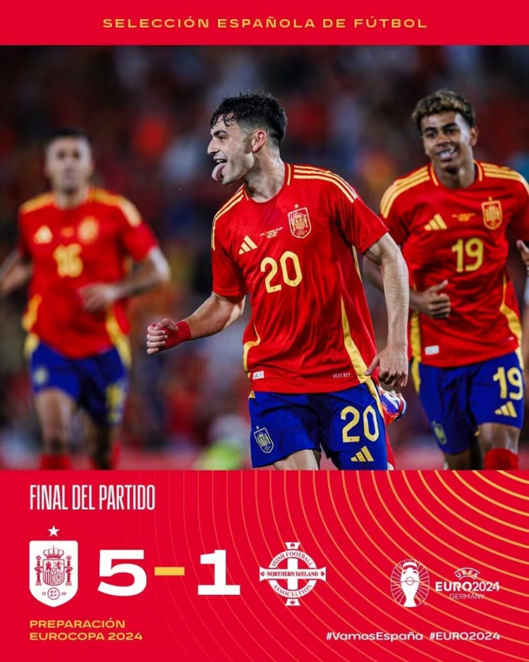 6月9日讯 国际友谊赛,西班牙对阵北爱尔兰。上半场,北爱尔兰闪击破门,西班牙由佩德里双响、莫拉塔、法比安进球连入四球。易边再战,奥亚萨瓦尔再下一城。最终西班牙5-1逆转北爱尔兰。