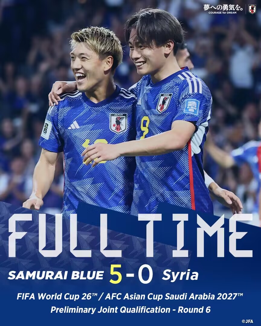 6月11日讯 北京时间6月11日18点14分,世预赛亚洲区第二阶段B组第六轮小组赛,日本对阵叙利亚。上半场,上田绮世头球破门,久保健英助攻堂安律扩大比分后又造成塔尔乌龙。下半场,相马勇纪造点后亲自主罚命中,南野拓实再进一球。全场比赛结束,日本5-0叙利亚。