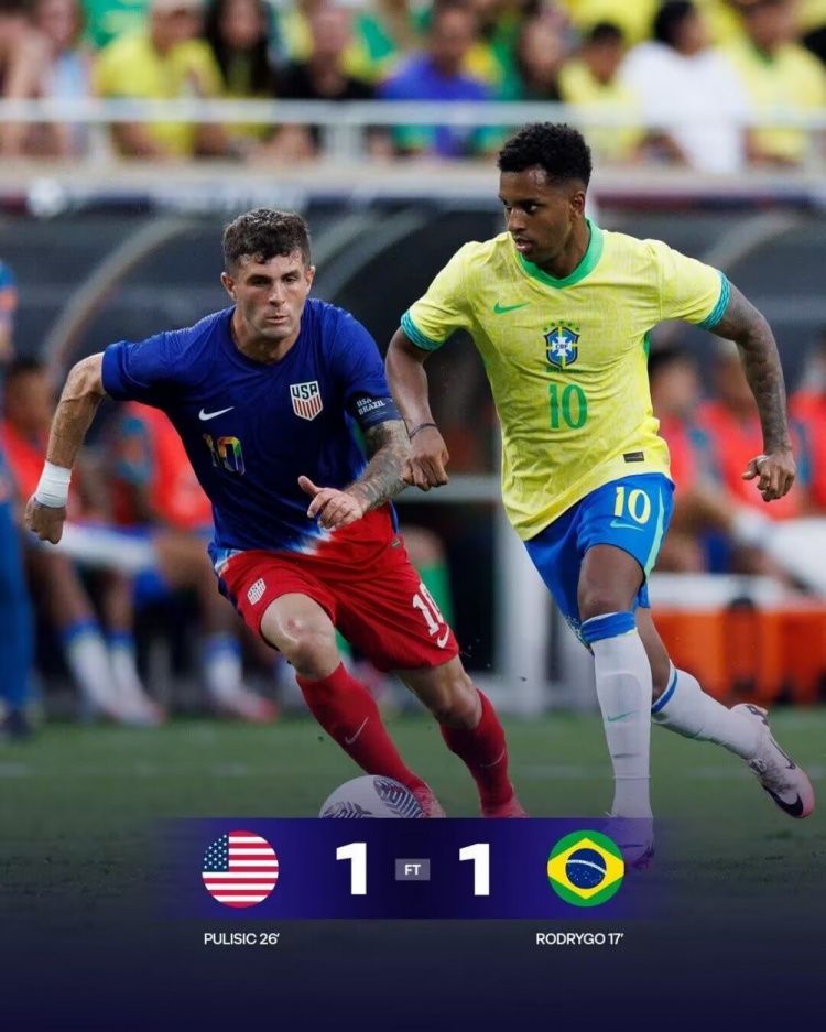 全场比赛结束,最终巴西1-1美国。